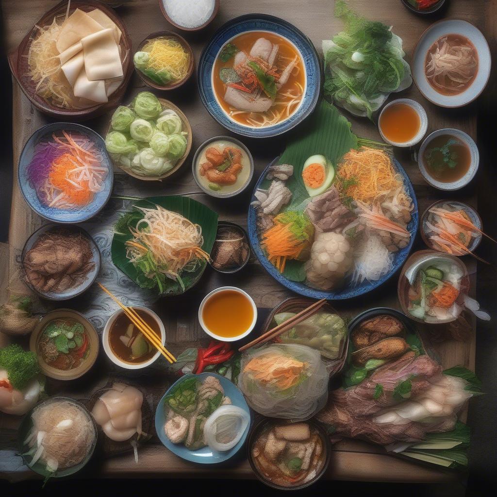 A colorful assortment of iconic Vietnamese street food dishes, including pho, banh mi, and goi cuon.