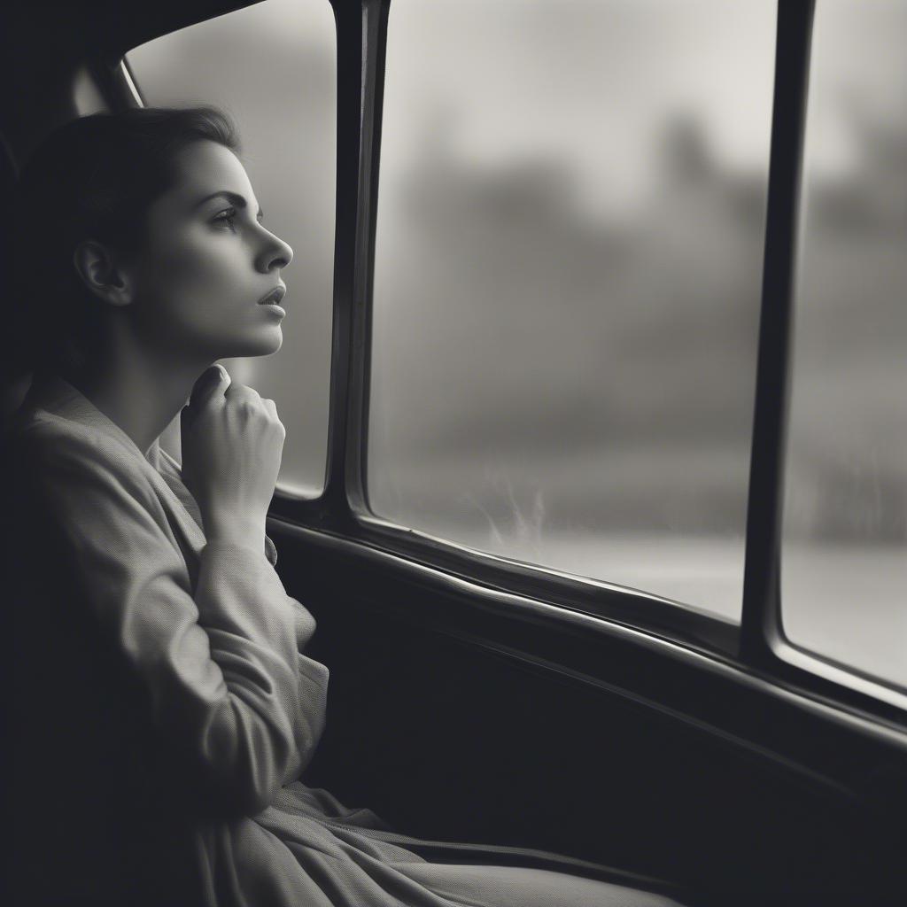 Woman looking pensively out a car window, contemplating life's journey