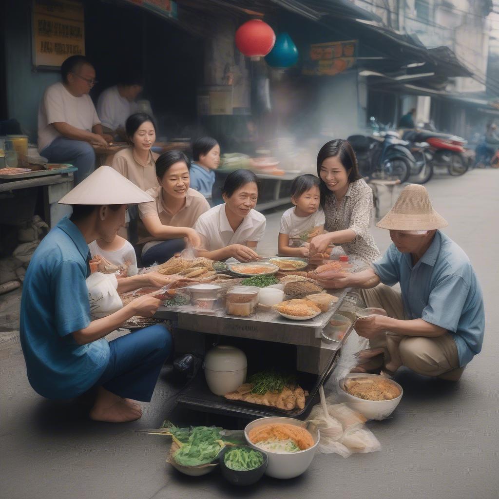 Family Enjoying Vietnamese Street Food Together