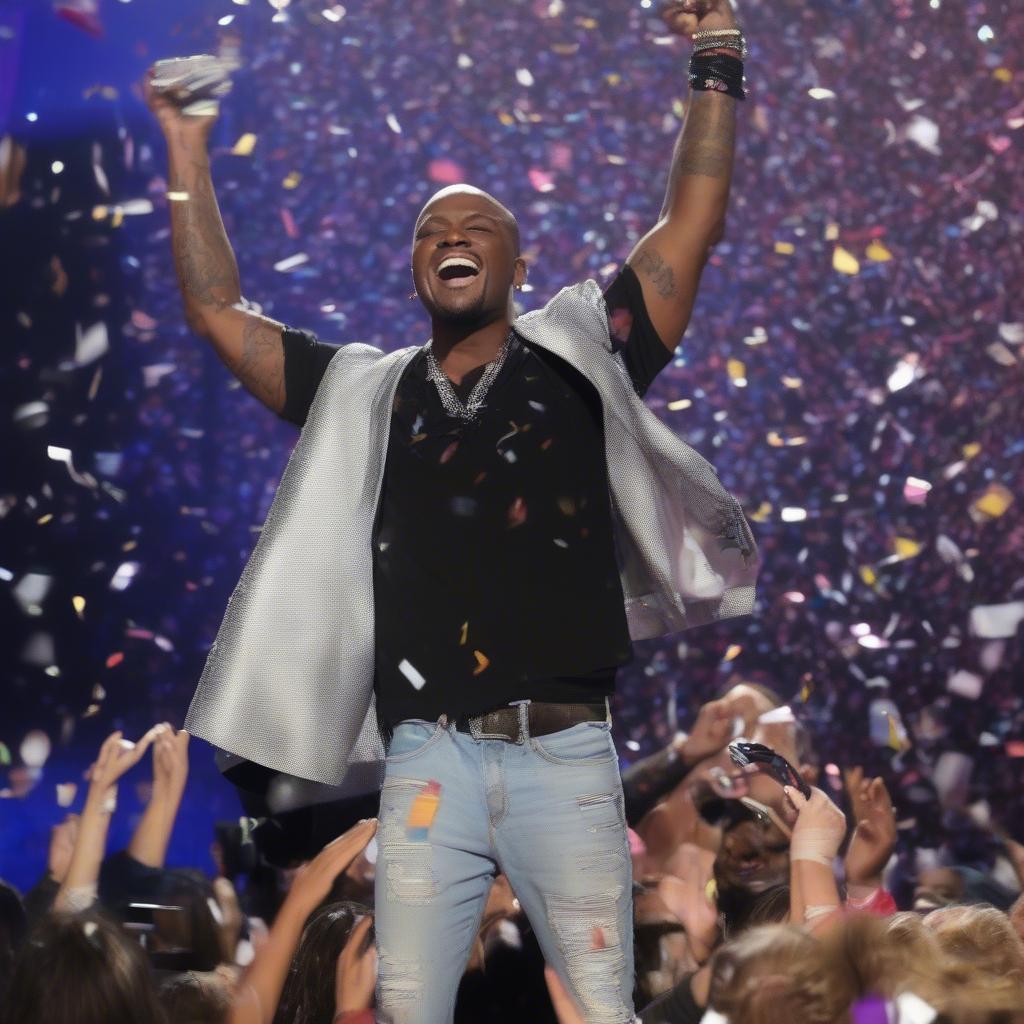 Jermaine Paul celebrating his win on The Voice season 2, surrounded by confetti and flashing lights.