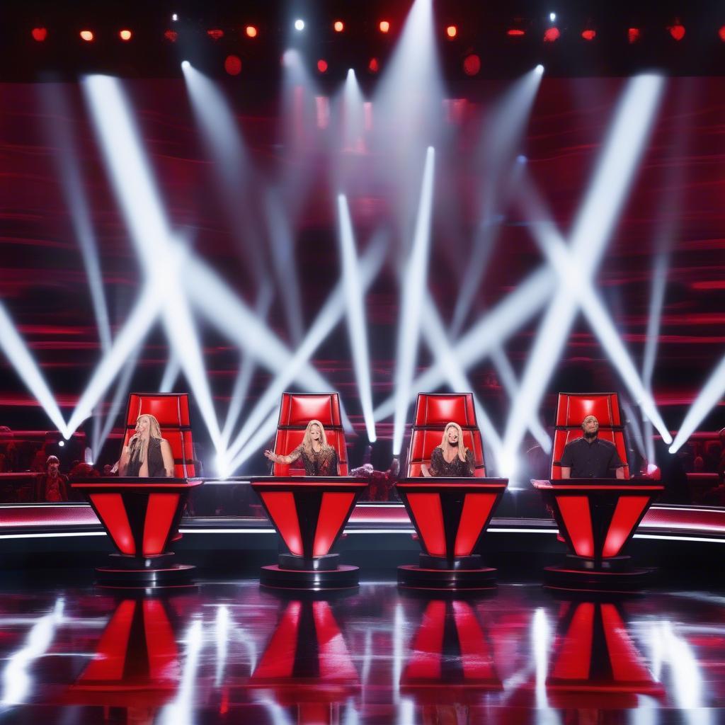 The Voice coaches sitting in their red chairs during the blind auditions, facing the stage.
